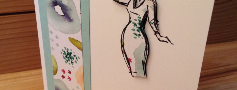 Judy Arawinko did a nice job designing this hand stamped greeting card for our shoebox swap. She added the new glimmer enamel shapes to the inside, layered with pool party cardstock, sentiment. The single lady is first stamped on the card base and also stamped on the Delightful Daisy designer series paper. Her dress and hat are fussy cut from the dsp and popped up from the card base using new mini-dimensionals. The single lady is from the stamp set Beautiful You.