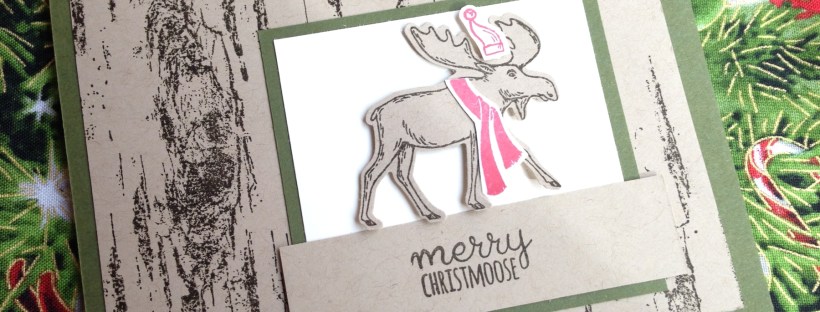My Mom designed this Merry Christmoose card. She knew when she saw these products in the holiday catalog (page 27) that she wanted to add them to her collection because the images would make good guy cards.
