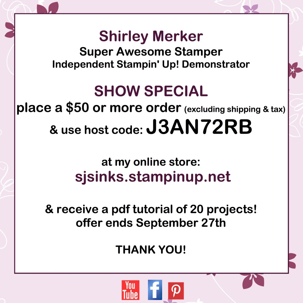 Click the Contact button on my blog or PM me in Facebook if you want to register for my online retreats or have questions about placing orders or being a member on my Super Awesome Stamper Team. Stampin’ Up! is offering a new demonstrator promotion which ends September 30th making it easy for you to join my team! Click here for details and scroll to the Get and Go Starter Kit Promotion for details.