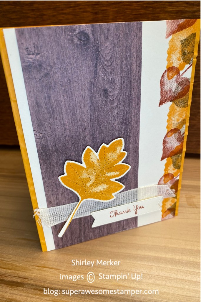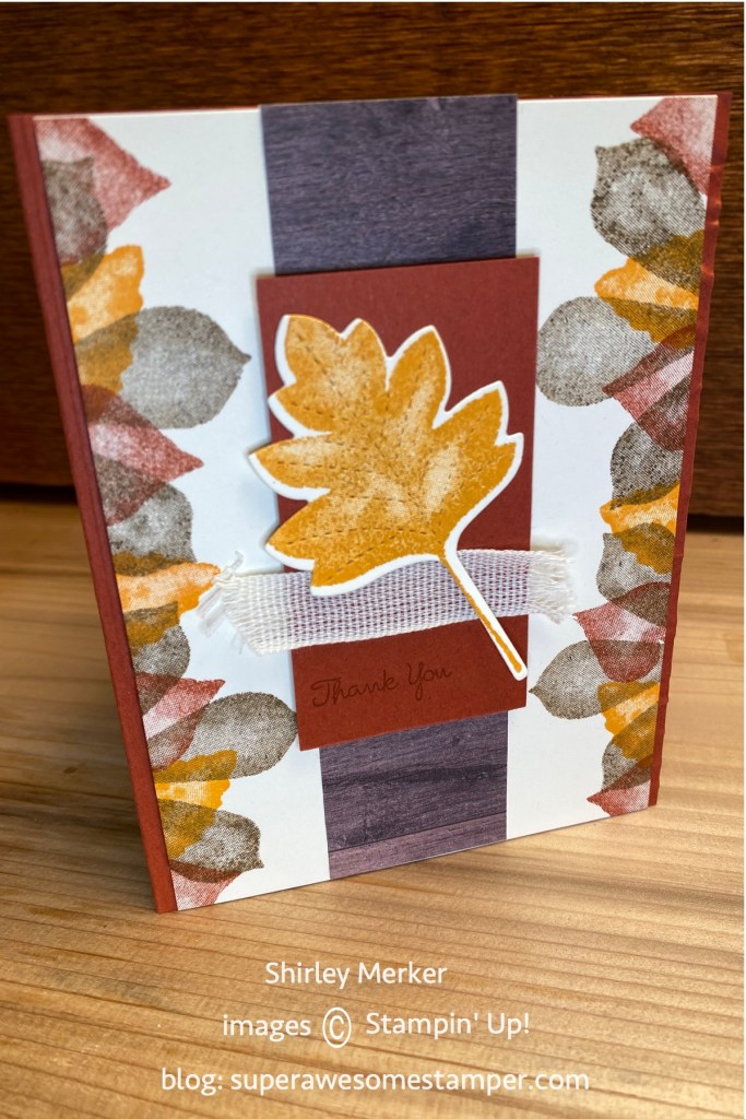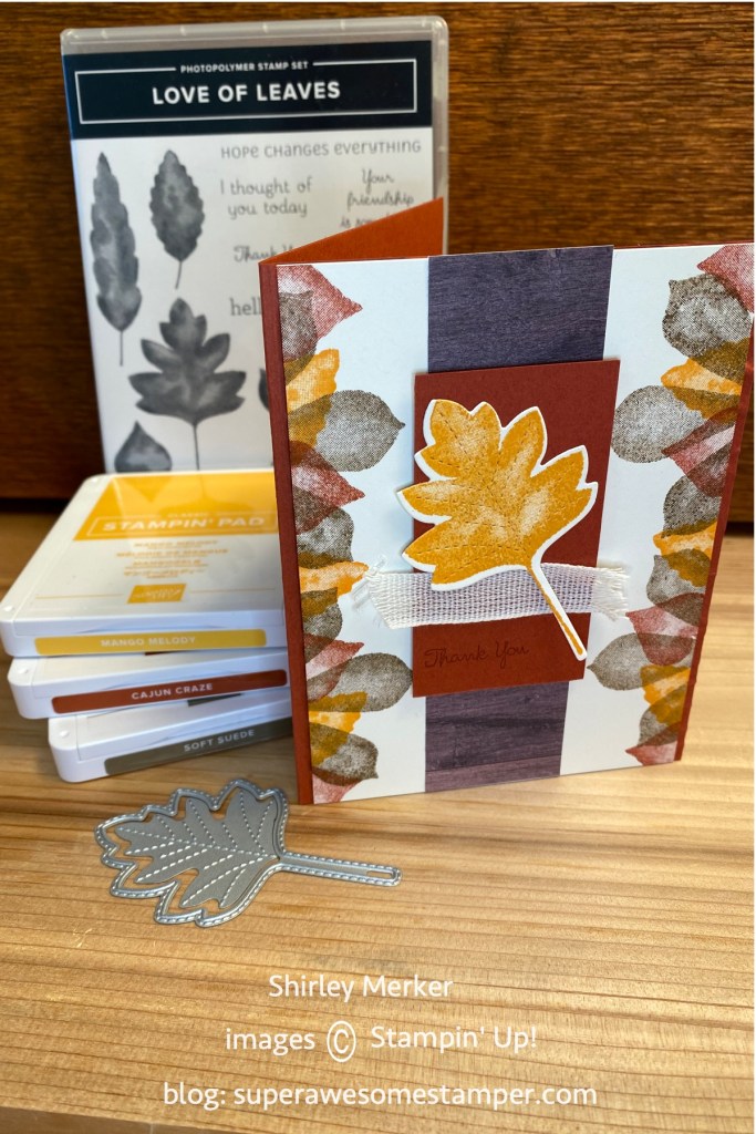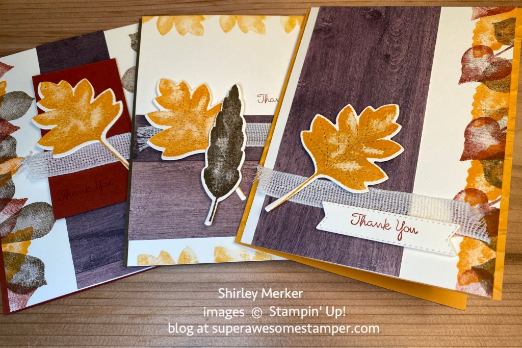 Love of Leaves stamp set, Stitched Leaves dies and In Good Taste designer series paper were my product picks for these hand stamped greeting cards. Card base colors are cajun craze, soft suede and mango melody.