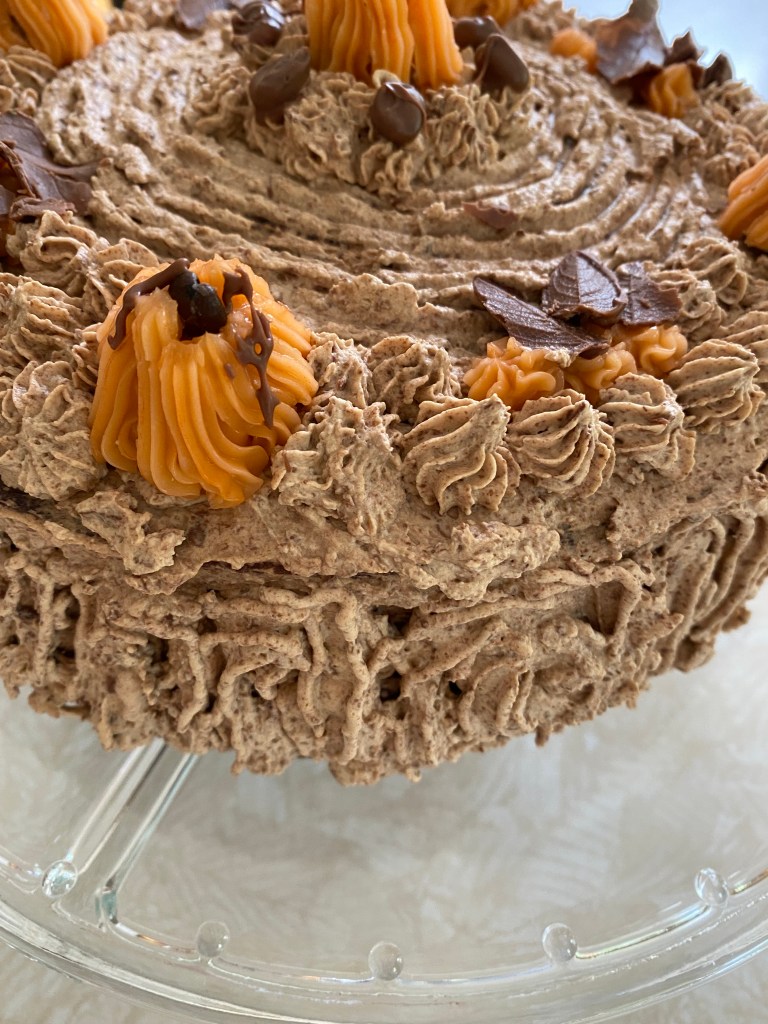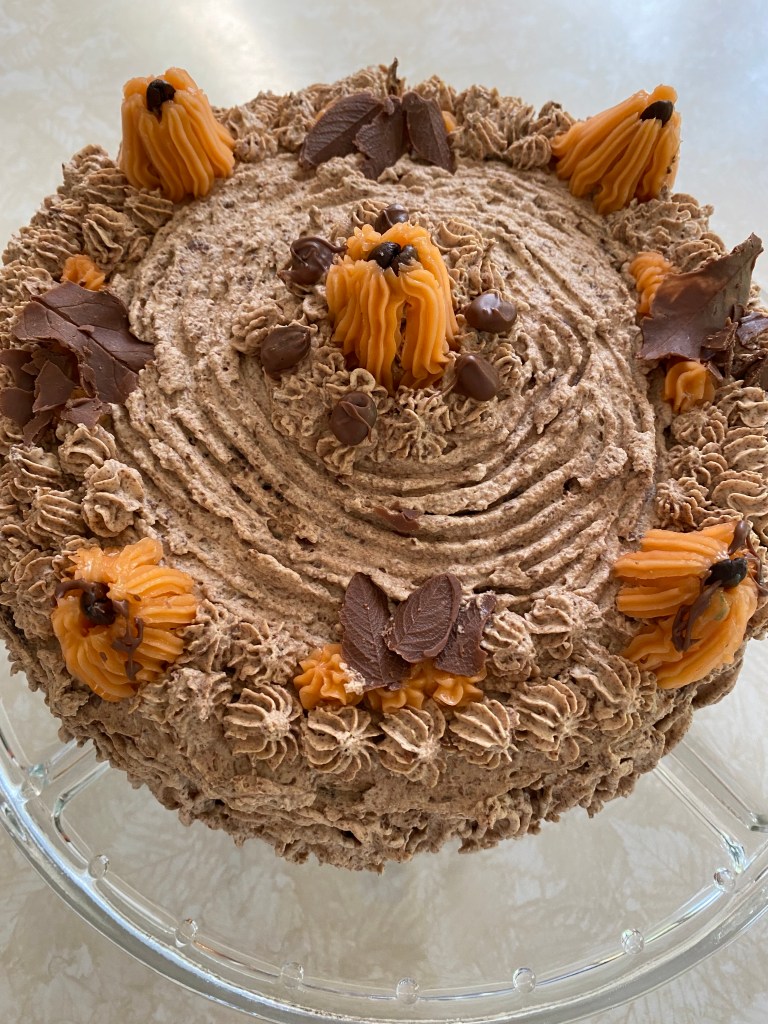 The pumpkins were piped using leftover over frosting from the first cake. Stems were plain coffee beans while the center circle had almond bark coated coffee beans. Leaves were molded using assorted tree leaves and almond bark. Definitely make this cake again. The mocha frosting is actually one we use to top chocolate chip cookies for tea.