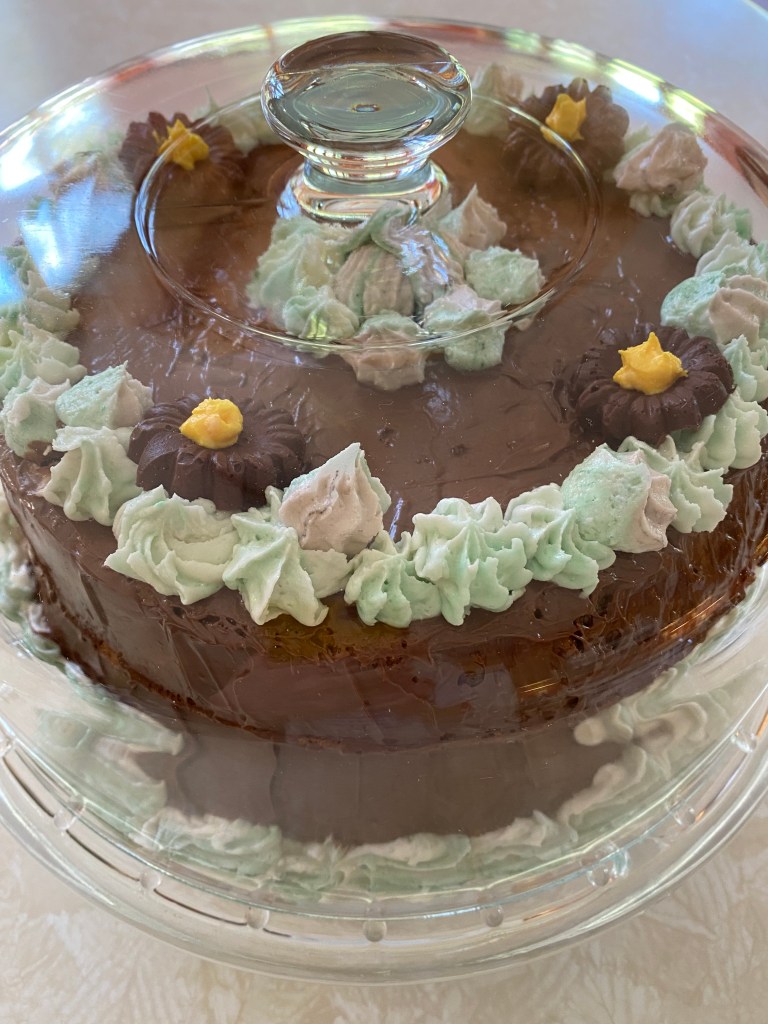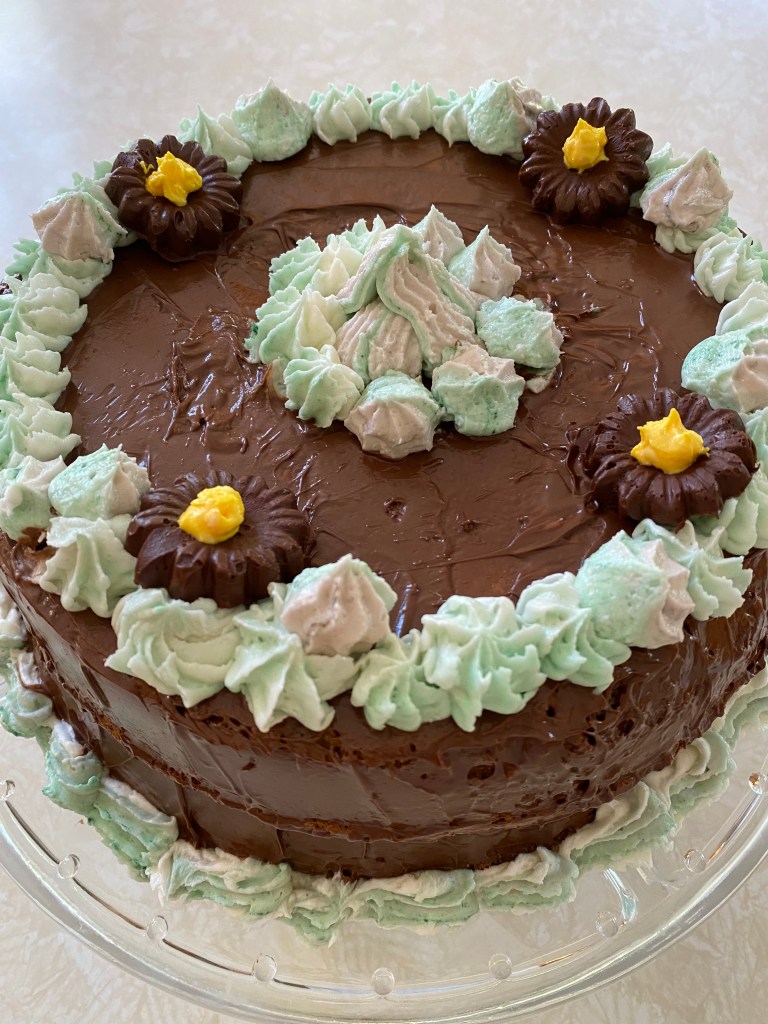 The chocolate glaze is Aldi’s Berryhill chocolate hazelnut spread. Raspberry jam was the filling. The frosting was butter, Crisco shortening, powdered sugar and raspberry extract so it’s shelf stable. Flowers are from molds with melted chocolate chips. A tiny bit of yellow tinted frosting makes the pollen flower centers. I was trying for a succulent theme but the Pampered Chef Easy Accent Decorating tool did not have the right tips. So settled for the stars and shell border instead.