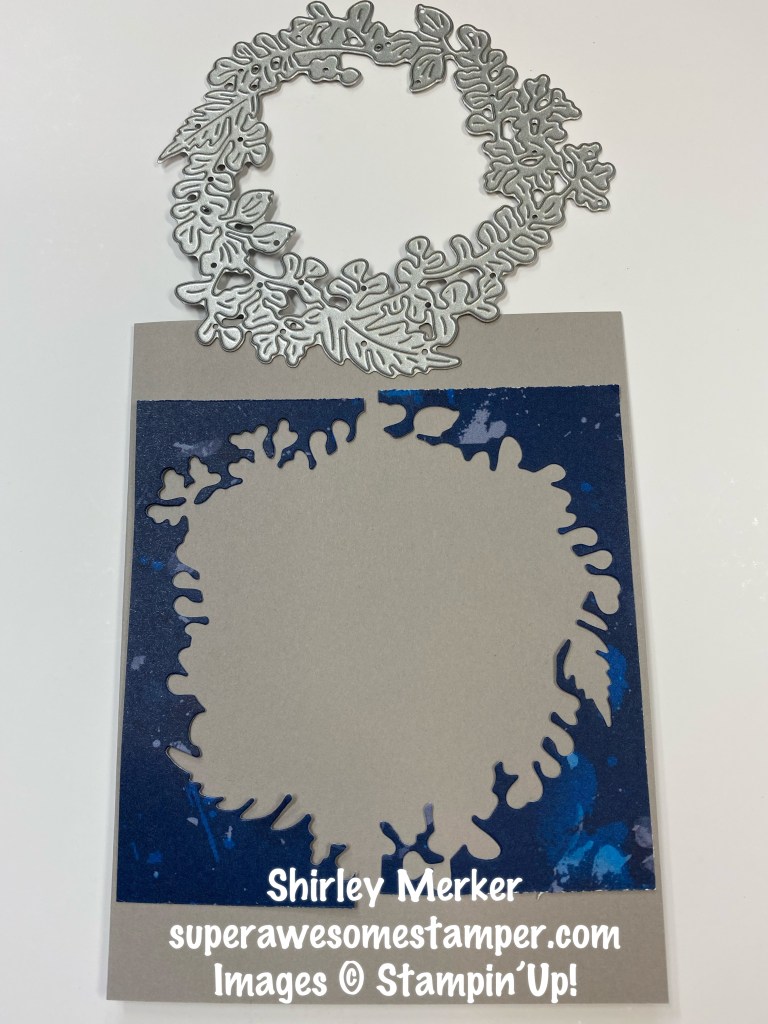 A left over, negative, die cut Sun Prints designer series paper was cut in half and tucked along either side of the card to pull in the blue tones of the design.