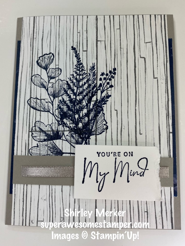 It’s nice to have a stack of sympathy cards on hand that are ready to be mailed. I mixed the white washed designer series paper from the Heart and Home package with Nature’s Prints stamp set, Gray Granite Shimmer Ribbon, Night of Navy ink and Gray Granite cardstock.