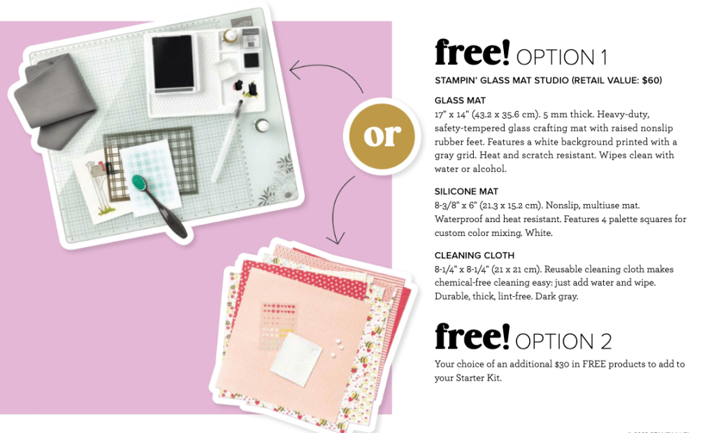 Option Uno – Did you see the brand new glass mat on page 17 of the Sale-a-bration brochure? It’s yours just for signing up to be member of my Super Awesome Stampers Team! Not interested in the mat, then select adding $30 of extra product of your chose to your starter kit dollars. That’s $155 of products for only $99 plus tax as shipping is free on the starter kit. Full details are through this link: click here!!!