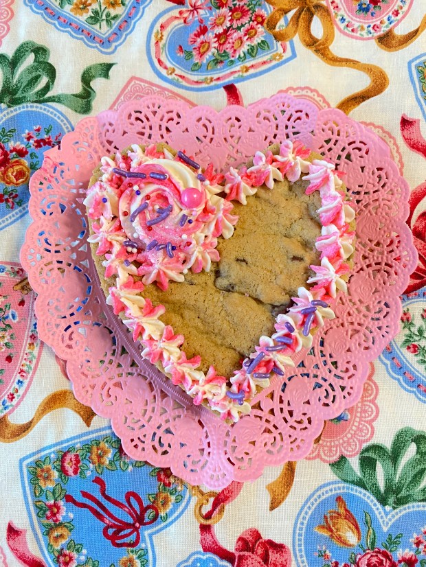 Here is a closer look at the 3.75 inch heart chocolate chip cookie cake. The doily is included but the background blue and pink heart fabric is not included.