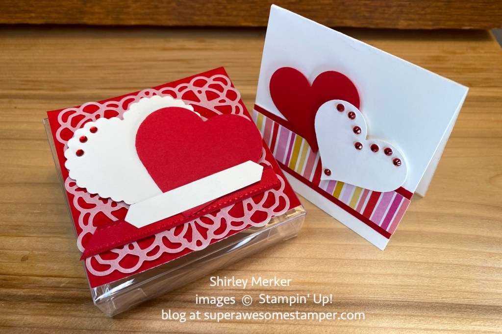 My living room was set up as kit central as I was preparing for this event, way back in November. The kit features our square acetate gift box decorated with lots of hearts in red and white and a gift note.