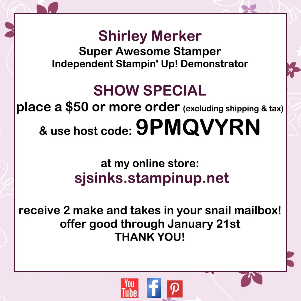 In addition, Stampin’ Up! will reward you with a minimum of $50 in orders too! It’s Sale-a-bration time where free, exclusive products are offered with every $50 purchase! See the free product options at my online store here. If the gift box circle turns bright pink from gray at my online store, that means you have rewards to redeem. So please look for the gift box circle to redeem all your rewards!