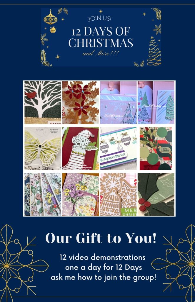 What’s the 12 Days of Christmas and More Facebook group about? It’s a group that anyone can join to watch the demonstration videos and add comments to the posts. A wide range of project styles will be showcased. Check out the sneak peek photo below. We have 6 more days to go, PLUS 2 bonus days not shown in the flyer! You can watch all videos on replay in the group in case you miss the live demonstrations.