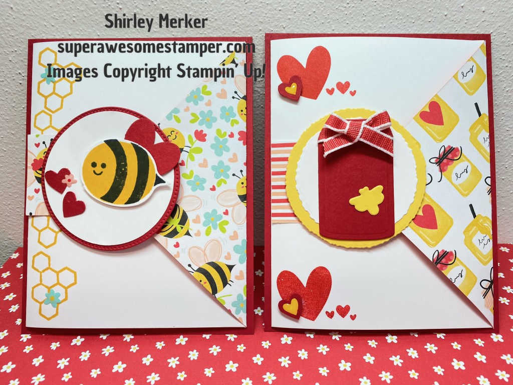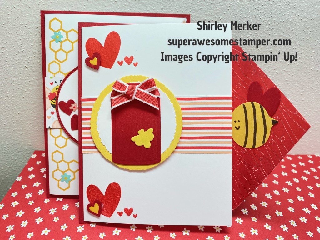 Each kit will include a yellow punched bee body as shown below. You add the strips and face using a black marker. The stamped bee in the top left photo, along with the honeycomb stamp and heart stamps will not be included in accordance with Stampin’ Up! policy of not including stamped images in kits. Punched hearts will be substituted for the stamped hearts. Please purchase the Bee My Valentine Bundle from my online store which includes the stamp set and punch if you want to complete the cards exactly like my design. The bundle item number is 162554.