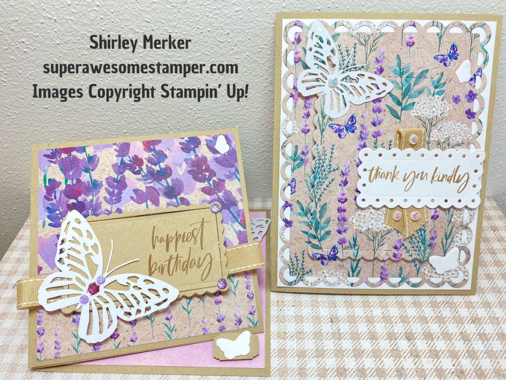 I have a pretty one for you in this round of Kits in the Mail for February 2024. It’s my two favorite colors, purple and crumb cake! These kits feature Perennial Lavender pattern papers, die cut butterflies and strips of Fine Shimmer Gems. One card features the Twisted Easel technique while the other is a standard card.