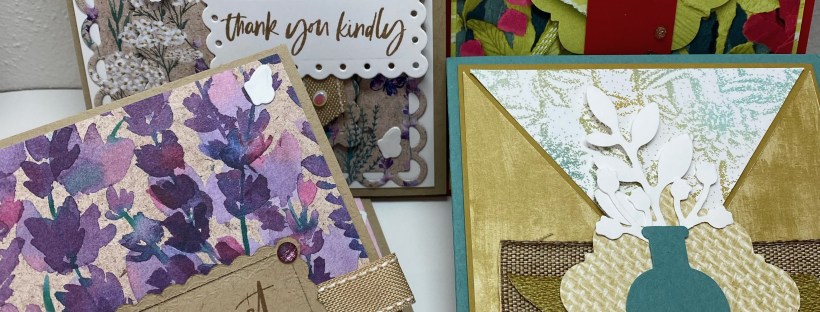 March 2024 features the Quad Triangle Technique using totally different pattern papers for 2 unique looks. Lots of punched shapes, ribbons and strips of embellishments are included in this kit along with 3 bonus samples of pattern papers to use as you wish.