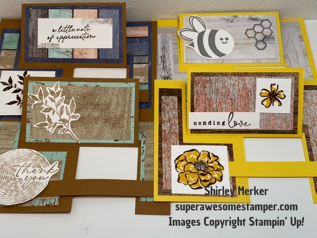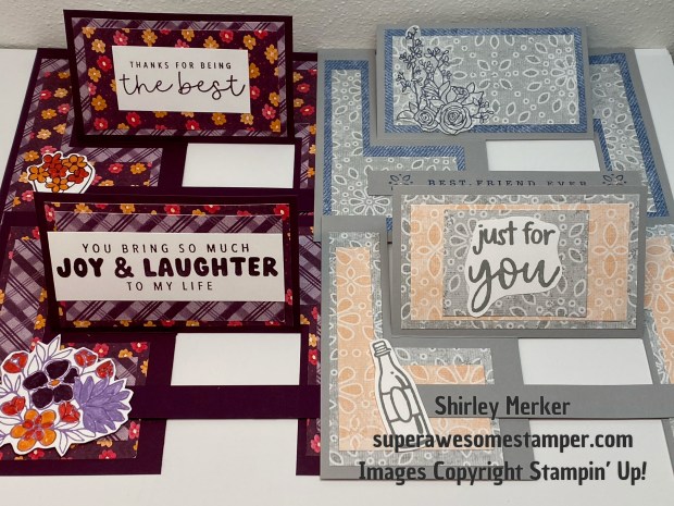 February features the Side Easel technique along with a standard card using coordinating products from the Perennial Lavender Suite. These include die cut butterflies and sparkly Purple Fine Shimmer Gems. Please purchase the So Refreshing stamp set (161344) from my online store if you want to complete your kits with the sentiments shown in the photo below. Crumb Cake ink pad (147116) was used as well.