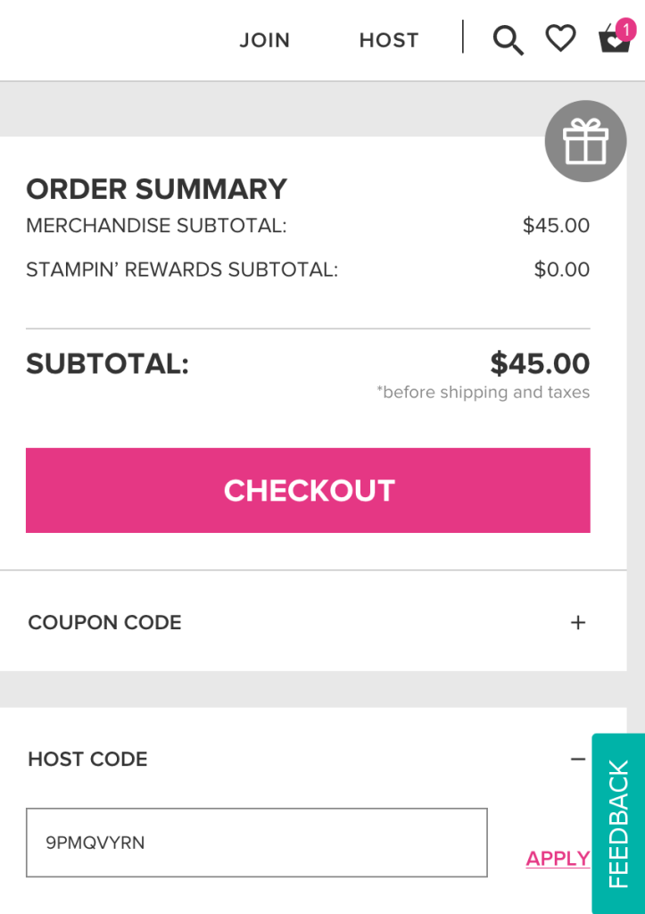 Next, I have added an item to my shopping cart as indicated by the pink circle with a 1 inside. Notice the gift box is gray which means no rewards have been earned. Look toward the bottom and click the plus sign next to host code.