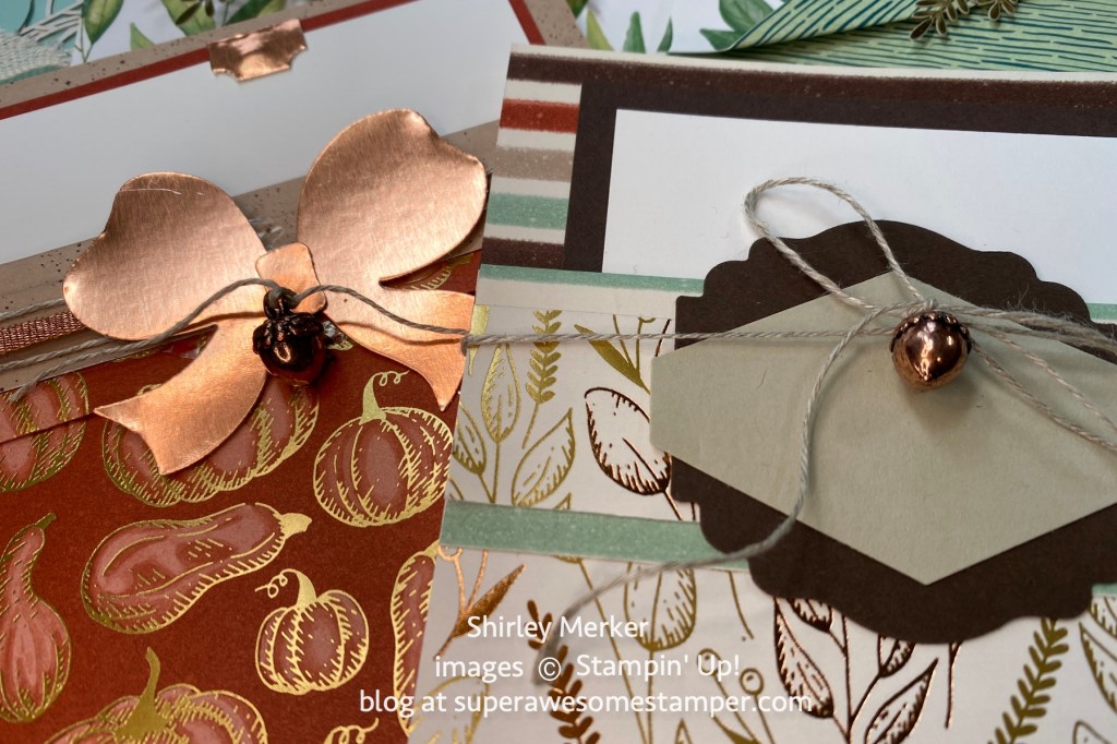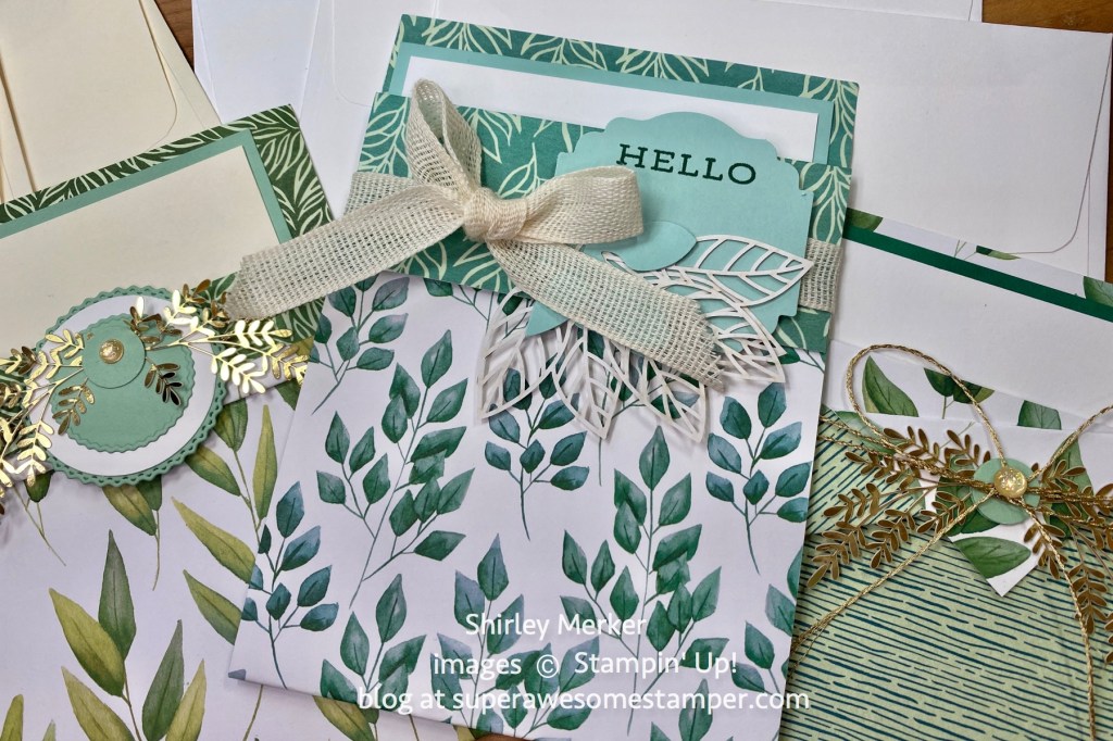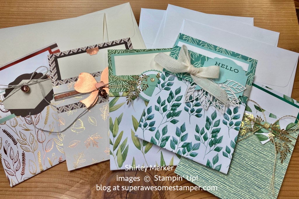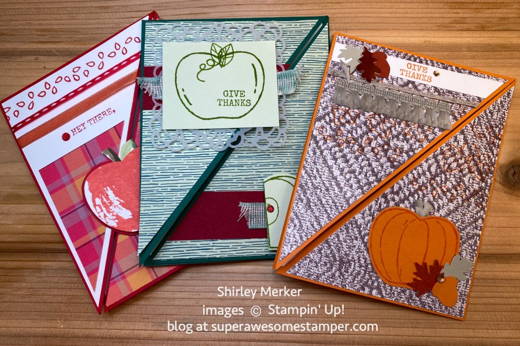 I’ll be clearing off my desk space so I can assemble these kits with you today at 2pm central through the One of a Kind Facebook group. They all feature angle cut cardstock so I called them my Angle Card Kits in the Mail. The Harvest Hellos stamp set and Apple Builder punch was used to finish the cards to create 4 different looks.