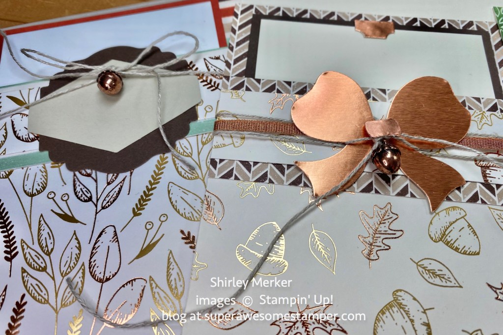 Assorted adhesives for piece assembly and scissors to cut the ribbons are needed too. Stampin’ Up! does not allow demonstrators to include stamped images in kits. So that is why you need to provide the stamp set, punch and ink pads. I’ll provide the papers for the stamped and punched images. I just can’t do that work for you. Last, your ribbons and patterned papers may arrive in assorted patterns and colors that are different from the sample photos. Thank you for understanding.