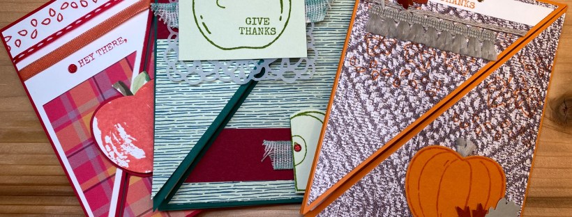 I’ll be clearing off my desk space so I can assemble these kits with you today at 2pm central through the One of a Kind Facebook group. They all feature angle cut cardstock so I called them my Angle Card Kits in the Mail. The Harvest Hellos stamp set and Apple Builder punch was used to finish the cards to create 4 different looks.