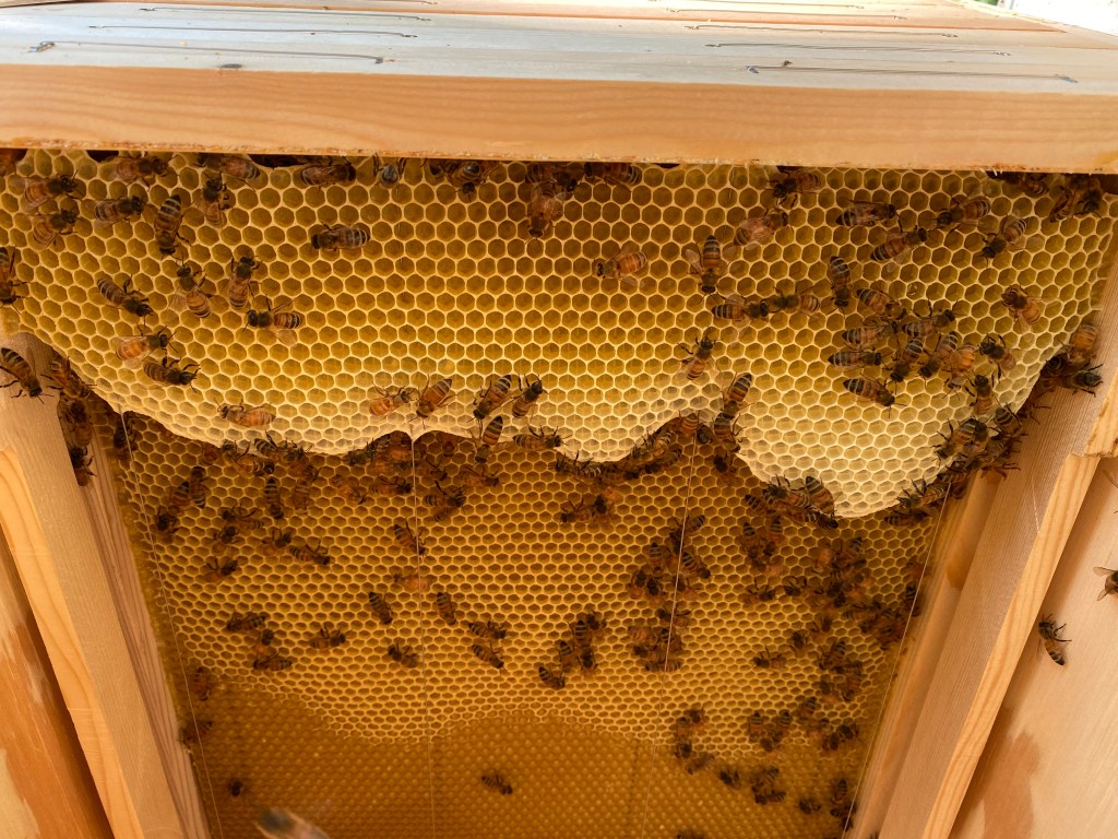 This is a sight and smell I’ll always enjoy…fresh comb building and a heavy, sweet scent of a thriving hive. The hive noise is something to enjoy too, a slow and steady hum of activity.