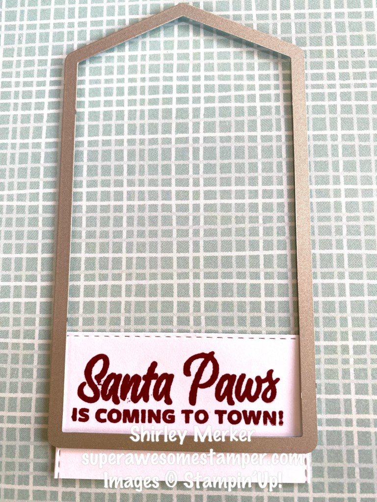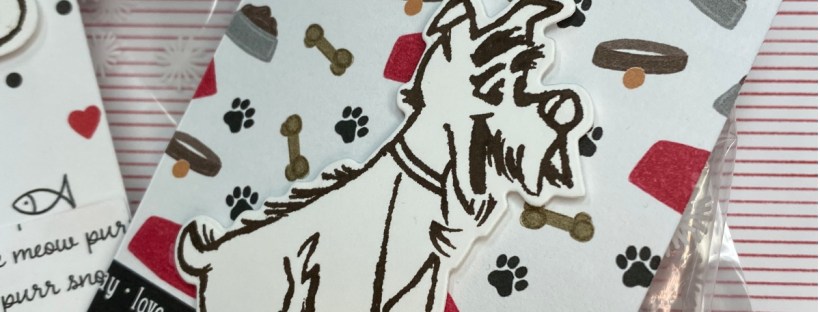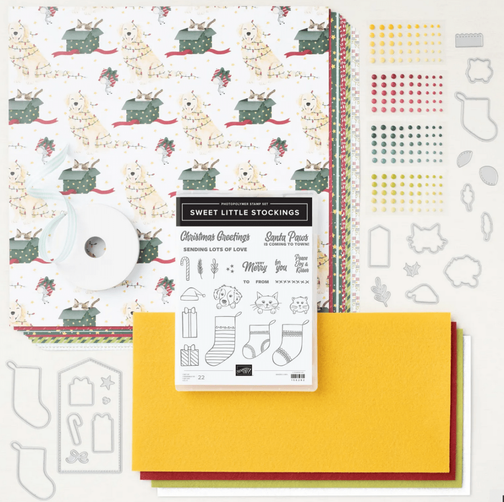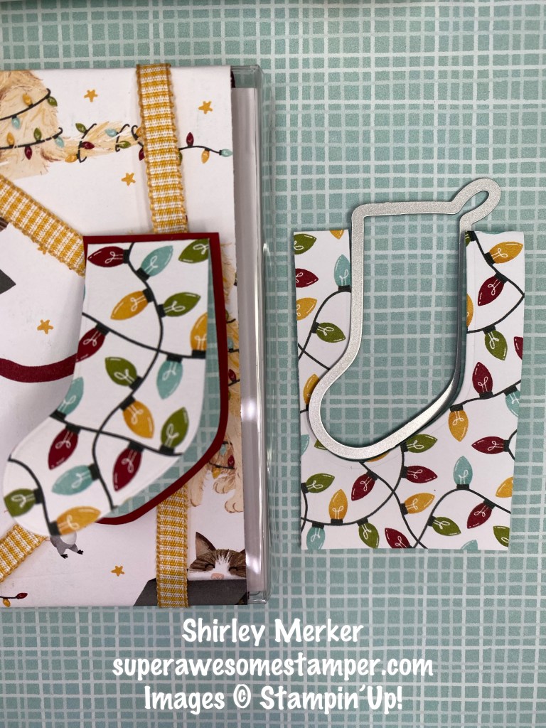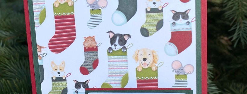 The Sweet Stocking suite is for the dog and cat lover. The images on the patterned paper are so cute! The paper is richly toned with cherry cobbler, evening evergreen along with shades of bumblebee, cinnamon cider, old olive and pool party. I decided to make a wrap to go around the Acetate Card Boxes. Position the patterned paper for a custom wrap tailored to the person receiving the box whether they like dog or cats.