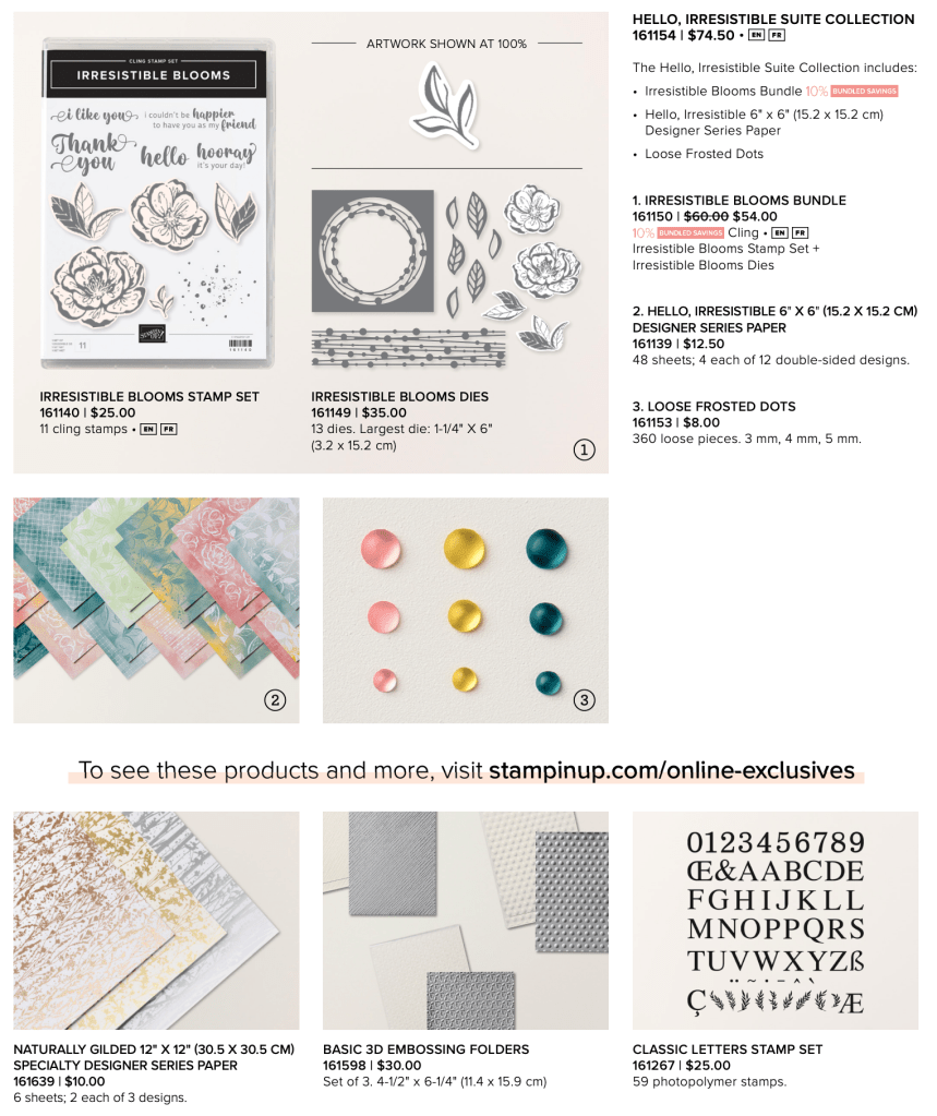 Stampin’ Up! is trying something new, Online Exclusives! These products are only available through my online store and are while supplies last. This new strategy helps us respond more quickly to relevant trends. So make sure you stay up to date with our Online Exclusive product releases throughout the year! Hello, Irresistible Suite Collection along with an additional paper pack, embossing folders and a letter stamp set are the first offering.