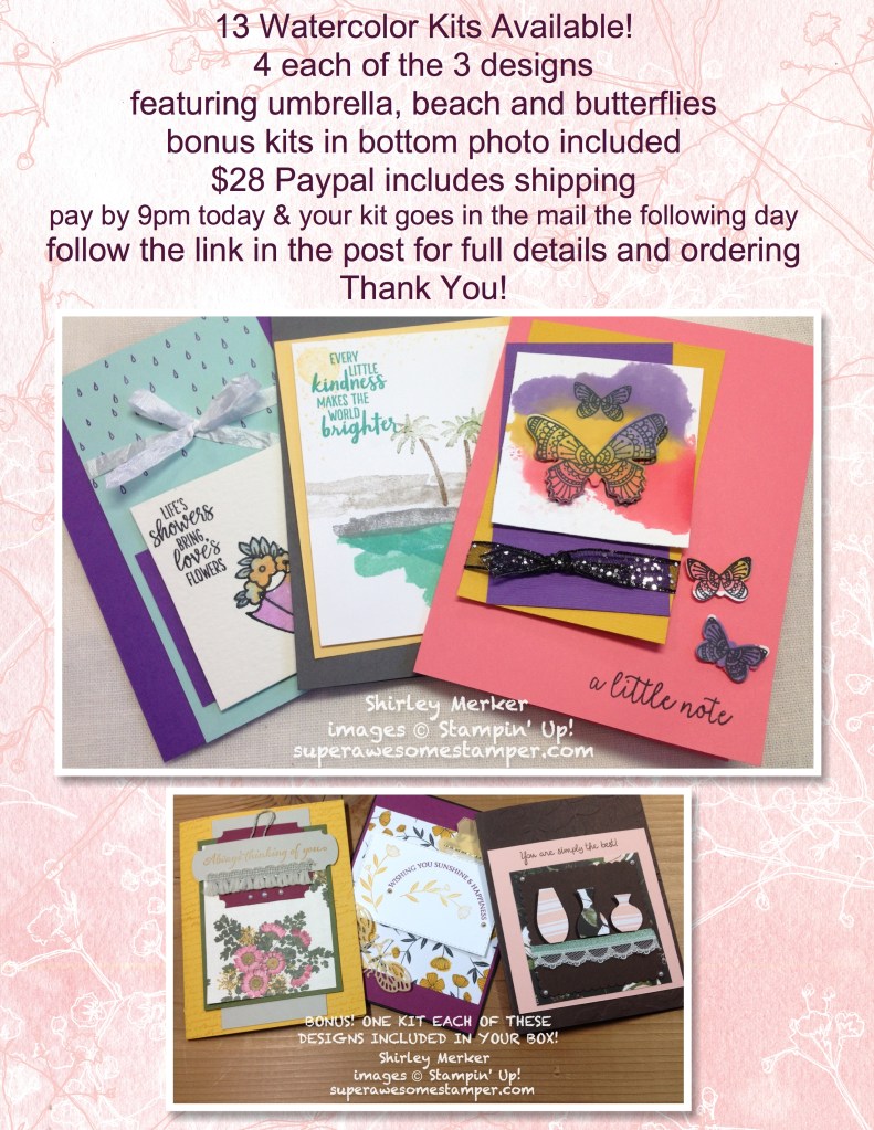 A Few Kits Available, Is One of Them Yours? June 2, 2020Leave a comment Follow this link for details and ordering. Thank You! Super Awesome Stamper Shirley Share this: Click to share on Facebook (Opens in new window) Facebook Like Loading...