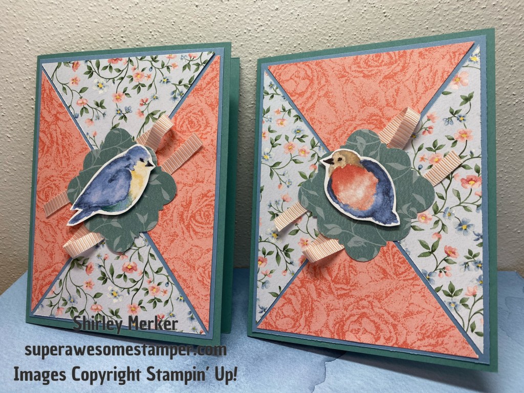 Designer Series Paper from the Flight and Airy and also the Softly Stippled packages were used to create the triangular shapes below. Fussy cut birdies from the Flight and Airy package create the focal points. Accent with strips of Petal Pink ribbon from the Ribbon Duo Combo Pack.