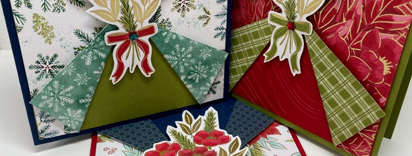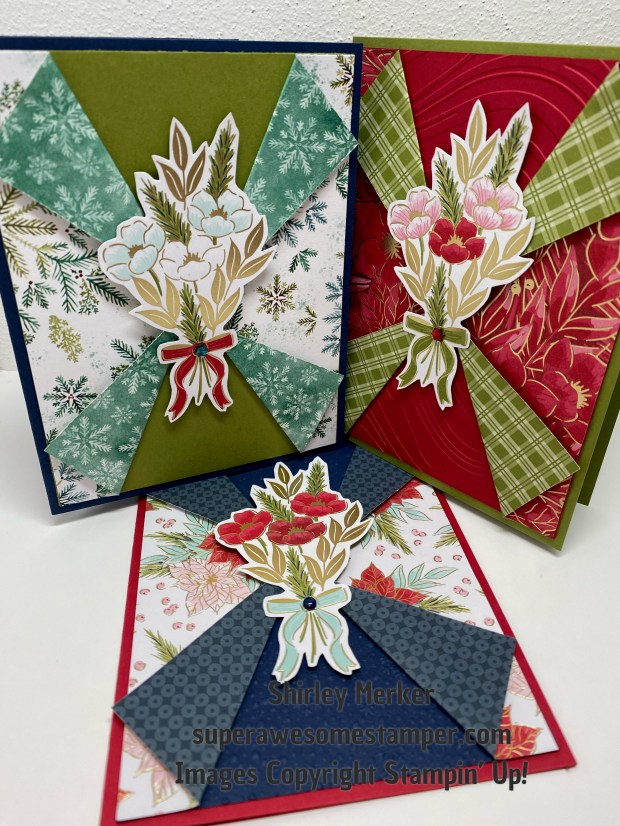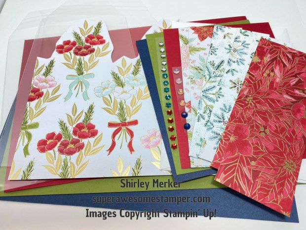 Kits feature supplies as shown below with supplies for 3 cards. Three pattern paper designs for the pleats, 3 festive floral bouquet, strip of embellishments and coordinating cardstock. Please note that Basic White inserts and scrap paper to stamp sentiments on are not included because supplies are very close to the 2 ounce mailing limit!