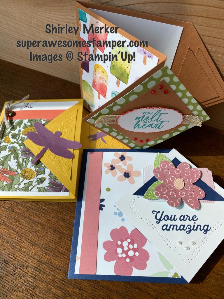 I was considering my design options for my next round of Kits in the Mail when my snail mail box was surprised with a Diamond Fold hand stamped greeting card from my friend Cyndi Pratt. It was an intriguing design that I had not seen before. So I thought I would share it with you so you can be intrigued by it too:)