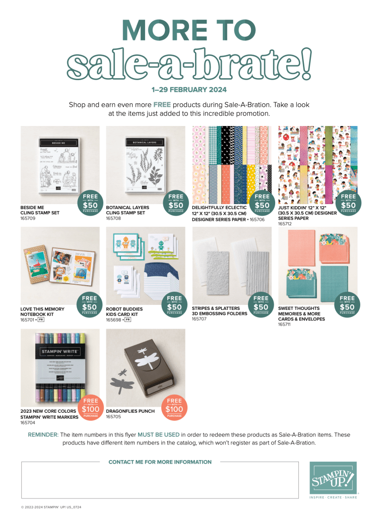 A few regular catalog items have been added as Sale-a-bration offerings. See the flyer below. You MUST use the item numbers listed in the flyer in order for them to come up as a free with purchase Sale-a-bration offering.